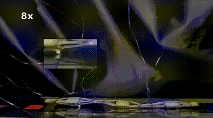 研究人員將三個(gè)“起重機(jī)”模塊連接組成爬行機(jī)器人,并分配每個(gè)模塊的收縮與松弛序列。連接在一起的模塊在啟動(dòng)時(shí)會(huì)互相約束,因此發(fā)生傾斜。