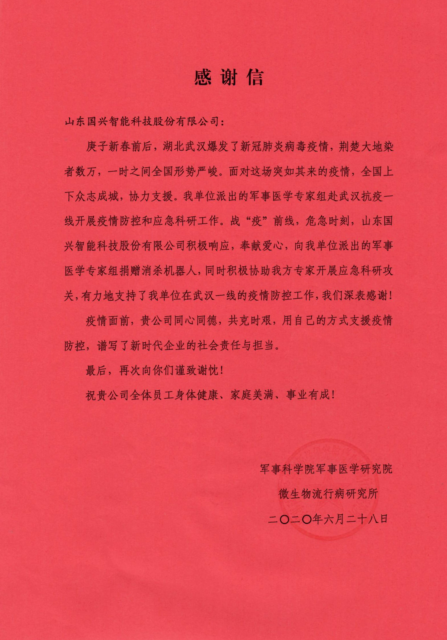近日,我司收到來自軍事科學院軍事醫(yī)學研究院微生物流行病研究所的感謝信。這是對國興智能疫情期間積極響應(yīng)、奉獻愛心的肯定。