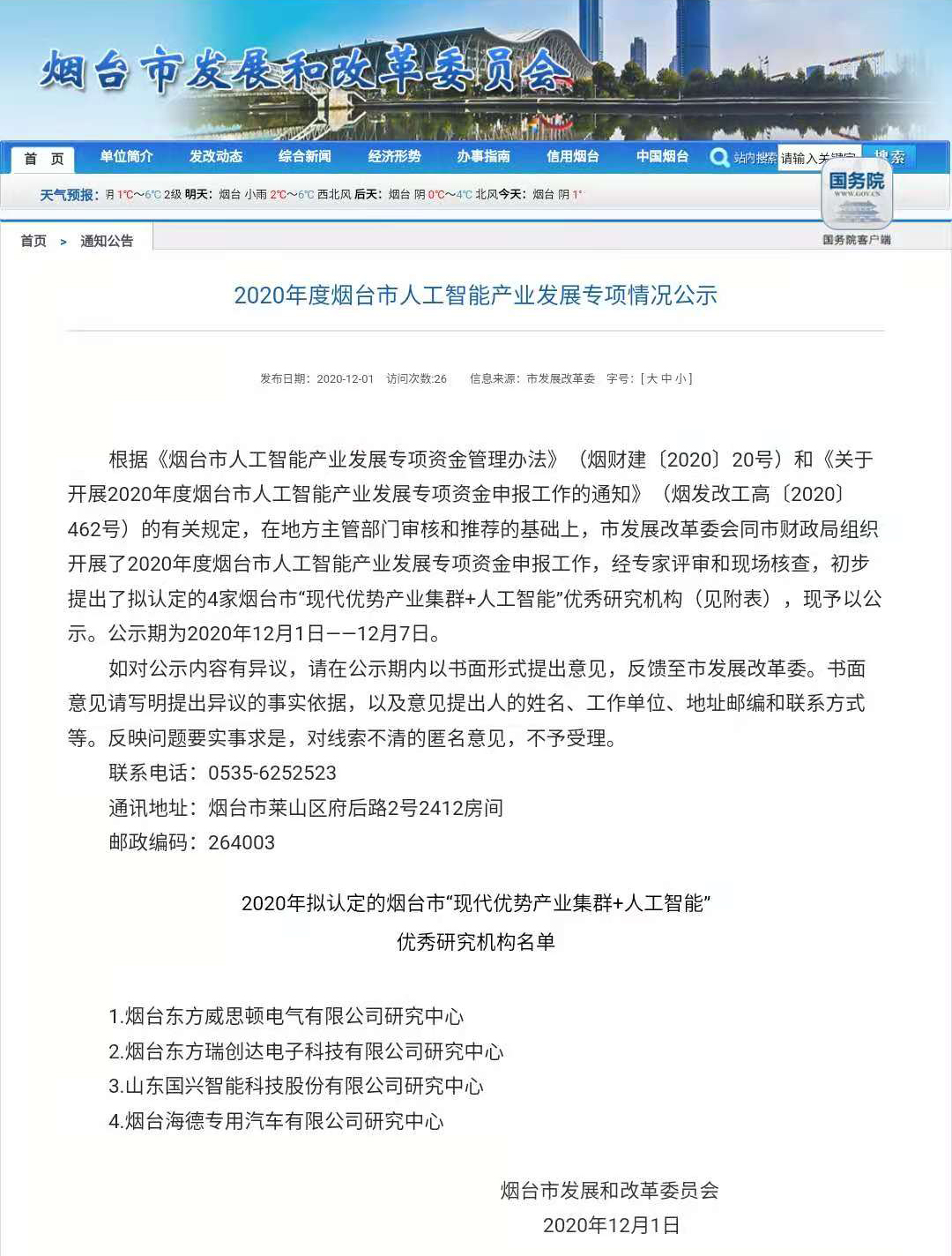 為加快推動(dòng)現(xiàn)代優(yōu)勢(shì)產(chǎn)業(yè)集群+人工智能創(chuàng)新發(fā)展,煙臺(tái)市發(fā)展改革委員會(huì)同市財(cái)政局組織開展了2020年度煙臺(tái)市人工智能產(chǎn)業(yè)發(fā)展專項(xiàng)資金申報(bào)工作,經(jīng)過專家評(píng)審和現(xiàn)場(chǎng)核查,國(guó)興智能榮獲“現(xiàn)代優(yōu)勢(shì)產(chǎn)業(yè)集群+人工智能”優(yōu)秀研究機(jī)構(gòu)榮譽(yù)稱號(hào)。