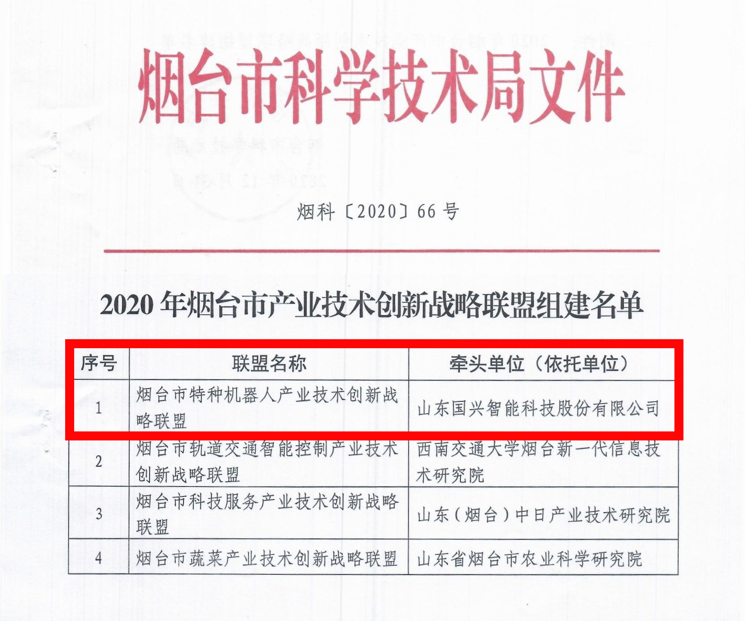 為推動煙臺市產(chǎn)業(yè)技術(shù)創(chuàng)新戰(zhàn)略聯(lián)盟的發(fā)展,近日,煙臺市科學(xué)技術(shù)局公布了2020年煙臺市產(chǎn)業(yè)技術(shù)戰(zhàn)略聯(lián)盟名單,名單中共有4家牽頭單位,國興智能名列其中。