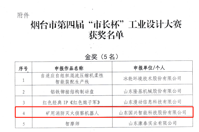 為了提高“煙臺設計”品牌影響力,推動煙臺市工業(yè)設計創(chuàng)新發(fā)展,促進工業(yè)設計與其他產業(yè)融合發(fā)展,助力煙臺爭創(chuàng)世界“設計之都”,以“設計點亮未來”為主題的煙臺市第四屆“市長杯”工業(yè)設計大賽中,經初評、終評、社會公示等程序,山東國興智能科技股份有限公司自主研發(fā)的礦用消防滅火偵察機器人憑借產品的科技創(chuàng)新性與技術突破性斬獲金獎。