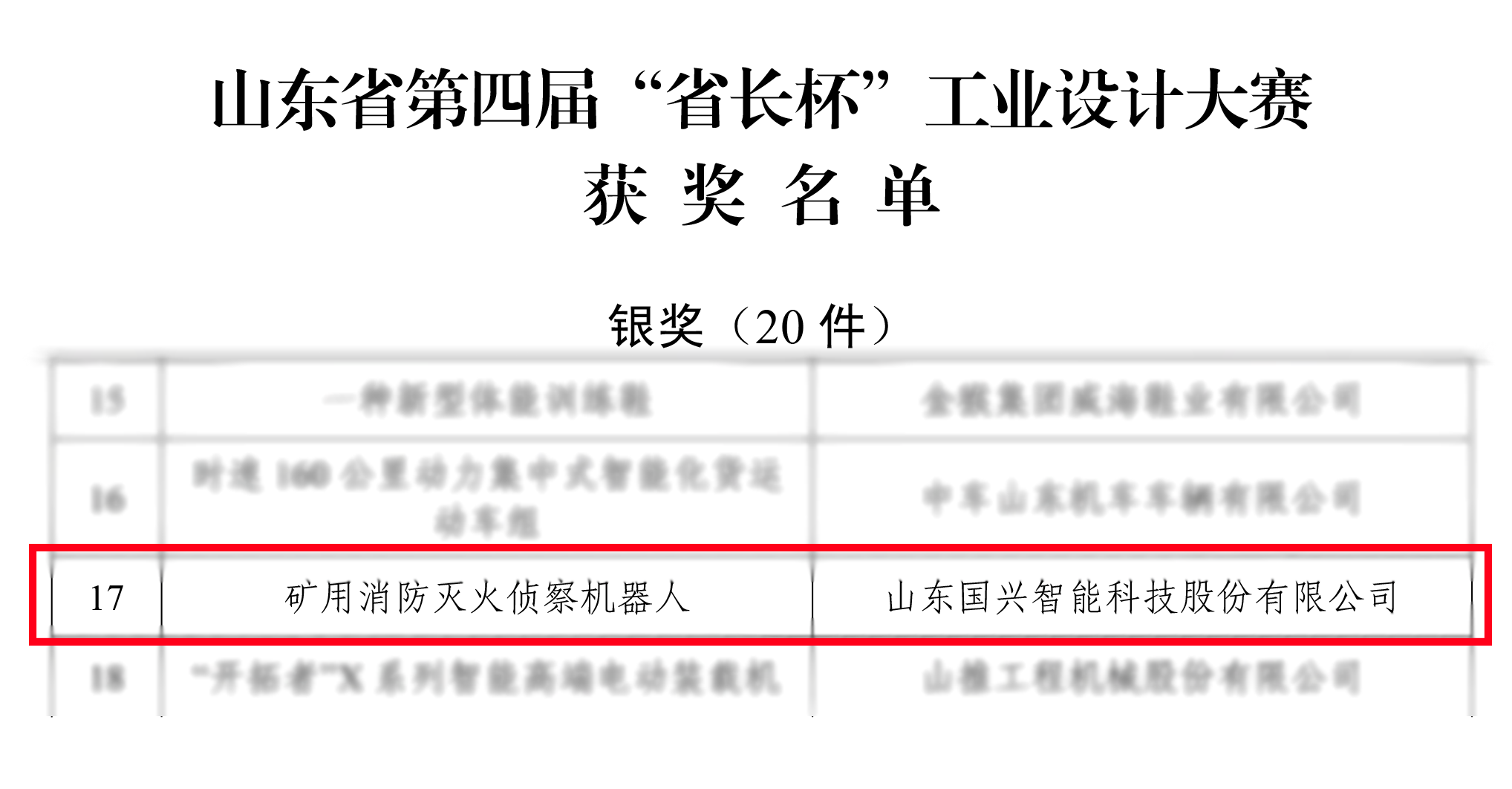 近日,山東省第四屆“省長杯”工業(yè)設(shè)計(jì)大賽獲獎(jiǎng)名單公布。山東國興智能科技股份有限公司《礦用消防滅火偵察機(jī)器人》項(xiàng)目獲得銀獎(jiǎng)。