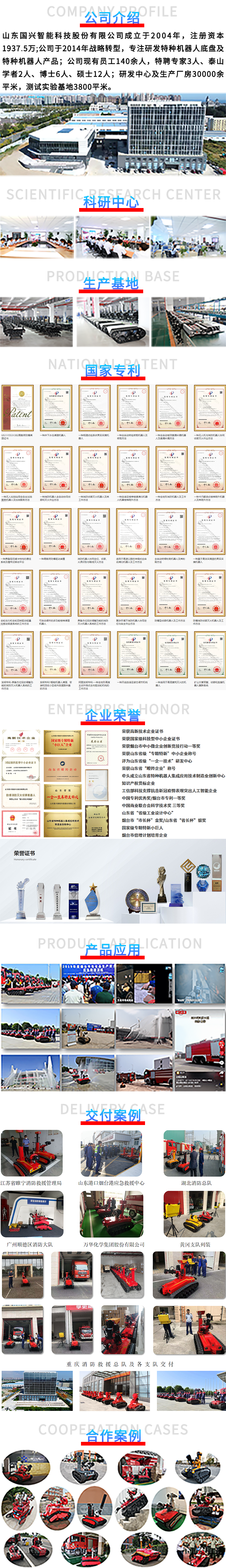 目前,公司推出了四驅(qū)燃油滅火機(jī)器人、防爆消防滅火偵察機(jī)器人、礦用消防滅火偵察機(jī)器人等60余種產(chǎn)品,產(chǎn)品數(shù)量領(lǐng)先國(guó)內(nèi)同行。公司產(chǎn)品已應(yīng)用于重慶市消防救援總隊(duì)、山東省消防救援總隊(duì)、萬(wàn)華化學(xué)集團(tuán)股份有限公司、山東港口煙臺(tái)港集團(tuán)有限公司、濱州市消防救援支隊(duì)、浙江大華技術(shù)股份有限公司、中國(guó)科學(xué)院、韓國(guó)斗山工程機(jī)械有限公司等企事業(yè)單位。