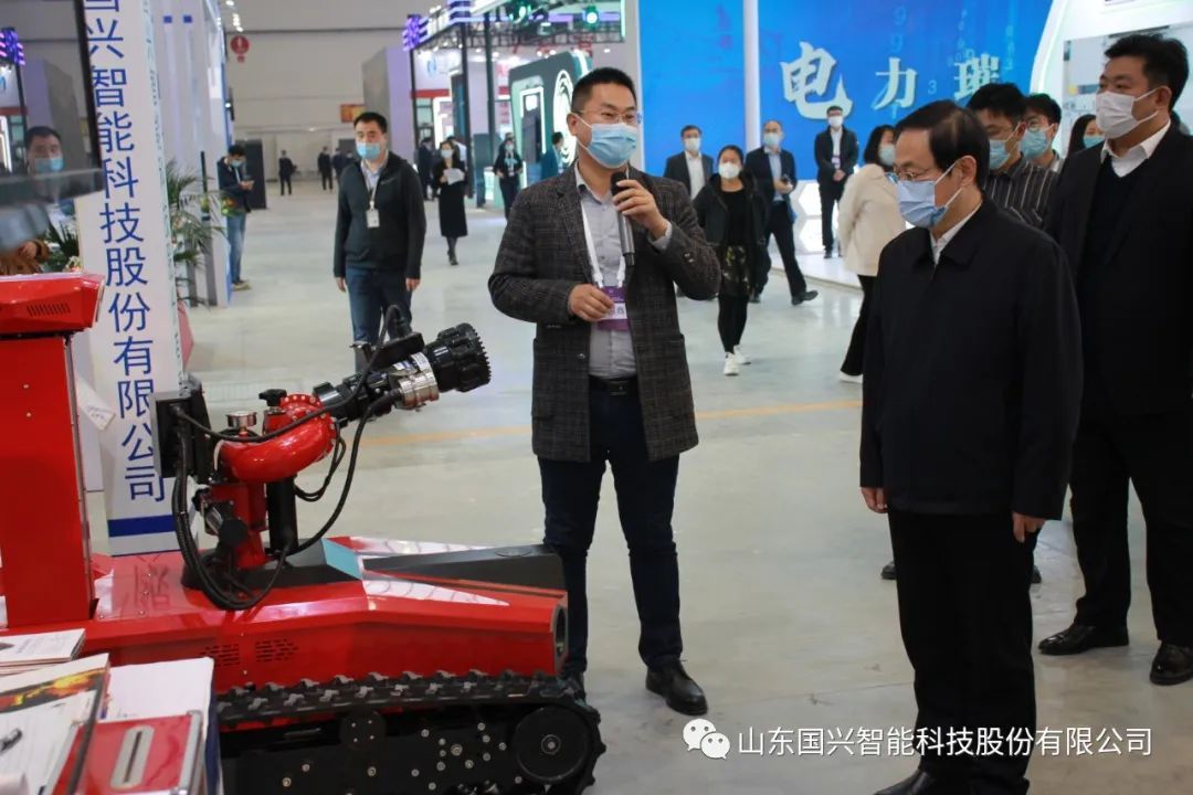 也正是因?yàn)閲?guó)興智能不斷在智能化、數(shù)字化方向不斷前行,在活動(dòng)期間,吸引了諸多領(lǐng)導(dǎo)來(lái)到展位前參觀。在8日當(dāng)天,山東省工業(yè)和信息化廳黨組書(shū)記、廳長(zhǎng)張海波來(lái)到國(guó)興智能展位前參觀指導(dǎo),在聽(tīng)完國(guó)興智能的企業(yè)介紹與產(chǎn)品介紹之后,對(duì)國(guó)興智能在消防機(jī)器人領(lǐng)域智能化、信息化、無(wú)人化方向發(fā)展給予肯定。